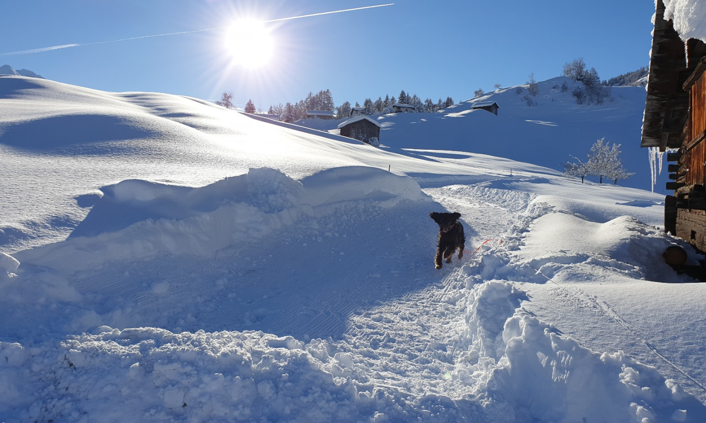 Frische Tage, klare Nächte – erholsame Spaziergänge mit dem besten vierbeinigen Freund im klaren Licht der Sonne oder im Schein der Sterne. Im Schutze der Bündner Berge schlendern Sie entlang eines ruhenden Bergsees oder eines gefrorenen Bachlaufs. Finden Sie Ihre Ruhe in der Beschaulichkeit der Val Lumnezia, geniessen Sie unsere Gastfreundschaft, lassen Sie sich umsorgen und gönnen Sie sich zum Beispiel eine Massage, einen kuscheligen Nachmittag oder ein Schwätzchen mit den Gastgebern.