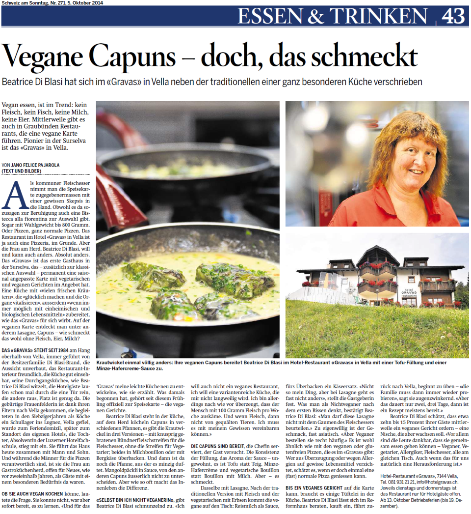Als erstes Restaurant in der Surselva bietet unsere Pizzeria Gravas in Vella zusätzlich eine permanente, der Saison angepasste Speisekarte mit konventionellen, wie auch veganen und vegetarischen Gerichten. Tagesgerichte, Thementage mit entsprechenden Spezialitäten und das Tagesmenu, das in drei Varianten erhältlich ist, runden je nach Saison unser Angebot an Speisen ab. Und, ganz wichtig, wenn immer möglich verwenden wir saisonale, einheimische und biologische Lebensmittel. Gluten- oder laktosefreie Malzeiten oder ein Frühstück mit Spezialbrot, hausgemachtem Zopf, auf Wunsch zubereitete Eiergerichte (gegen Aufpreis) oder frisch zubereitetem Birchermüsli sind kein Problem bei uns. Lassen Sie sich also in der Stiva Blaua, der Pizzeria oder auch auf der blumengeschmückten Panoramaterrasse nach Strich und Faden verwöhnen!